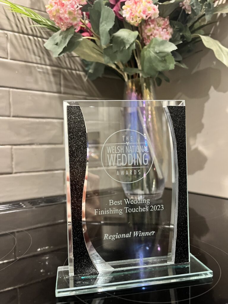 Back in November 2023, whilst cwtched up on the sofa with my son Macsen one Sunday evening, my phone pinged beside me. I glanced over to have a quick scan of the message and that’s when I had my “pinch me” moment! A fellow wedding industry supplier had sent me a message to let me know the incredible news….. I’d only gone and won at The Welsh National Wedding Awards for regional Winner under the “Finishing Touches” category. I was absolutely buzzing – although slightly gutted I couldn’t be there in person to collect my award on stage and have my picture taken with David Emanuel.