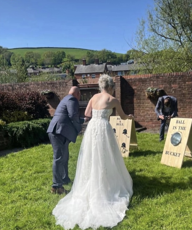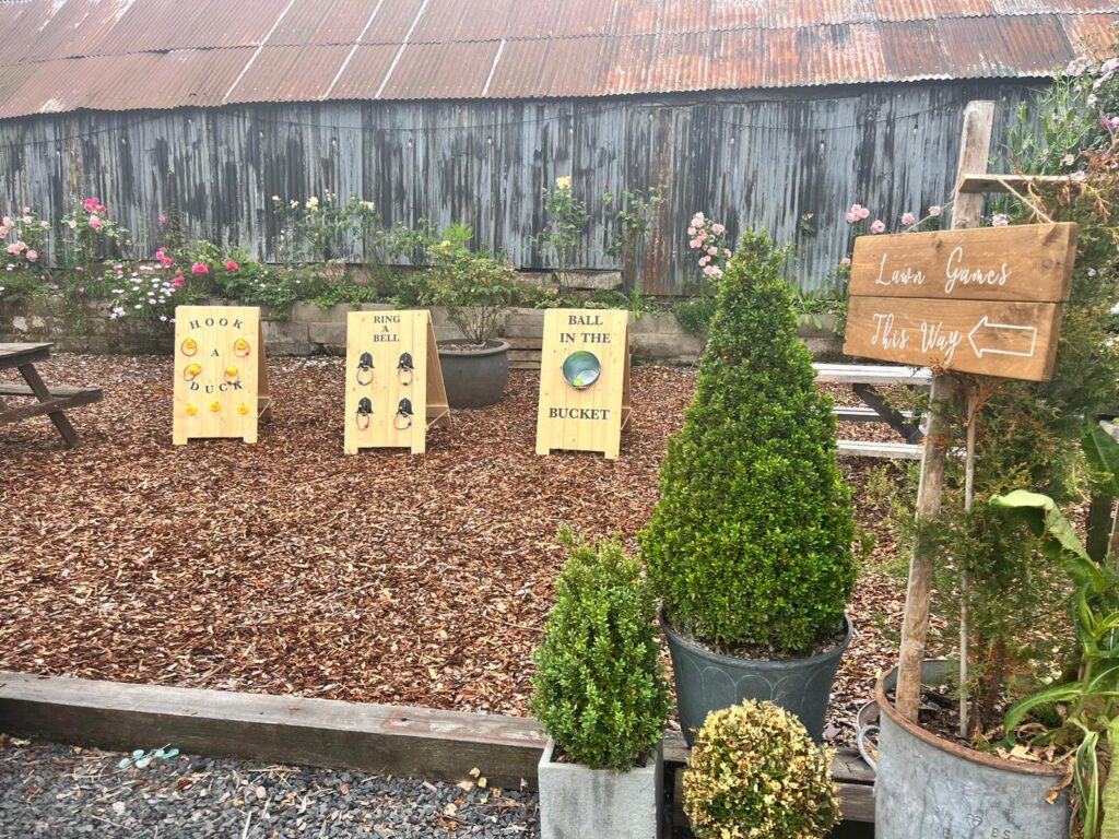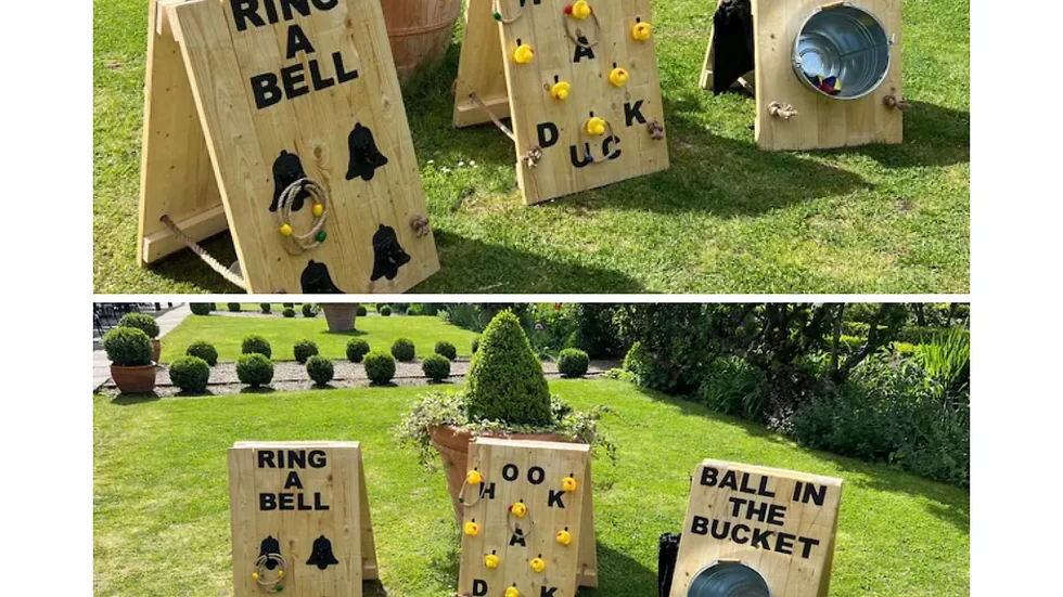 Includes a set of 3 rustic lawn games: “Hook a duck” “Ring the Bell” & “Ball in the bucket”